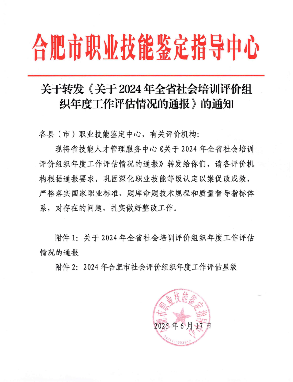 近日,合肥市職業(yè)技能鑒定指導中心發(fā)布關于轉(zhuǎn)發(fā)《關于2024年度全省社會評價組織年度工作評估情況的通報》(皖技管服函〔2025〕2號),我機構憑借卓越的工作成效和規(guī)范的管理體系,榮獲“2024年度五星級社會評價組織”稱號。標志著職業(yè)技能等級認定工作邁入全新階段。